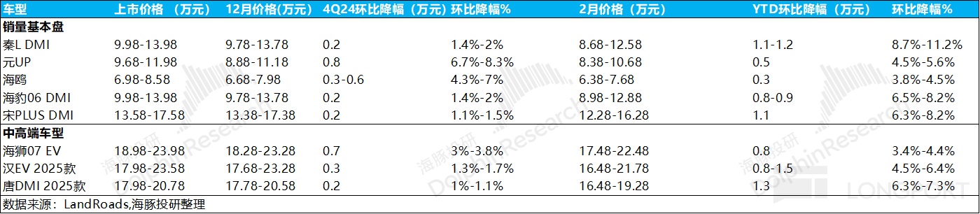 注:3 月杰兰路未公布比亚迪老款车的促销情况,库存车的促销仅统计到 2 月,实际第三方数据 3 月降价车型继续扩大(如宋 L DMI 3 月降价 12%)