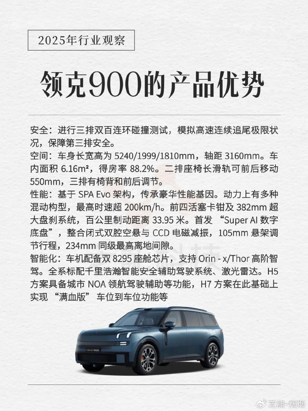 作为领克品牌旗舰家用大型 SUV,领克 900 基于 SPA Evo 架构,融合安全、空间、性能与智能化四大核心优势,搭载 Nvidia Thor/Orin-X 芯片、千里浩瀚智驾系统,目标锁定国内细分市场前三。