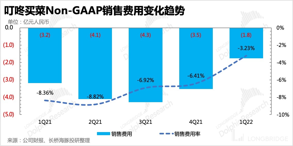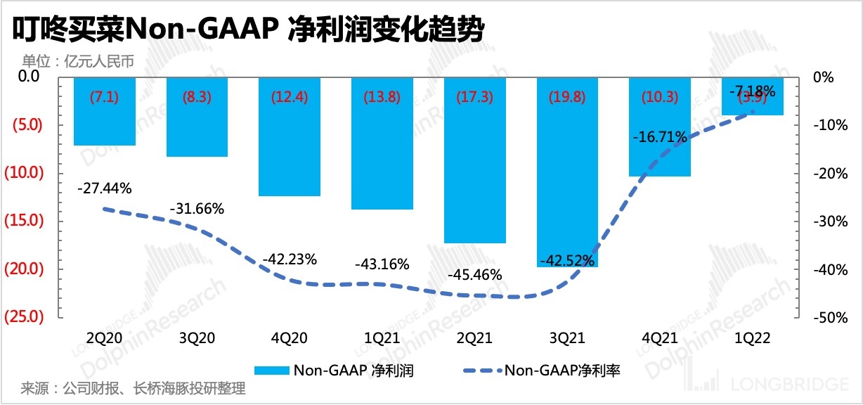 叮咚买菜在本月初发布的一季报中,减亏幅度非常亮眼,Non-GAAP 净亏损率由去年一季度的 43% 缩窄至 7%。