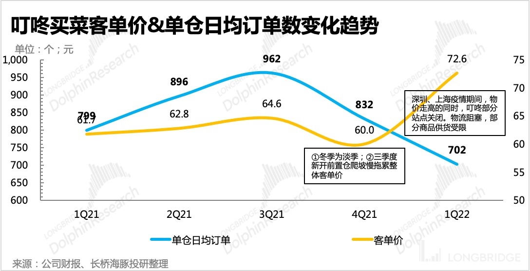 而从客单价来看,优惠券门槛提高对客单价拉升的作用并不明显(一季度的 72.6 元有疫情扰动影响)。不过考虑到门槛提高的同时,叮咚买菜也是扩张期,处于爬坡期的城市新仓用户客单价较低,可能也拖累了优惠券门槛提高的效果。