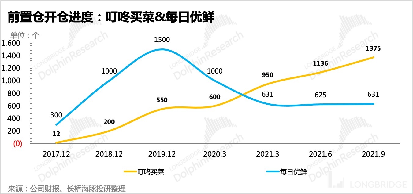 但在上市拿到 5 亿美金的巨额输血后,叮咚买菜却马上开启了攻城略地的动作。前置仓个数从上市之前的 989 个,快速扩张到去年三季度末的 1375 个,半年时间增幅高达 40%,这种扩张的节奏有点类似 2019 年的每日优鲜。