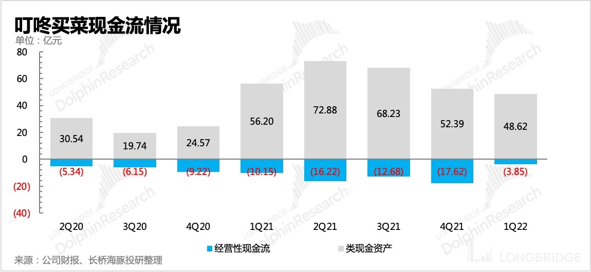 最后再来看看烧钱公司必须要关注的现金流风险,从目前来看,叮咚账上类现金资产(现金及现金等价物、受限现金、短期投资)余额为 48 亿元人民币,一季度经营大幅改善,是的经营性现金流出缩窄至 3.85 亿元。还是那句话,如果一季度的经营状况可以维持并且后续不断挤出利润,那么叮咚买菜现金流风险并不大。