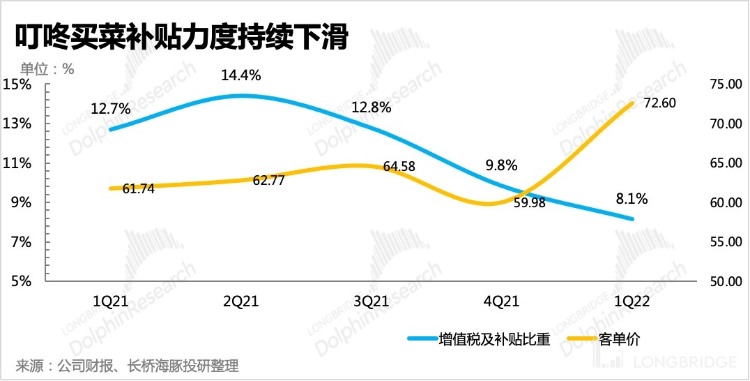 财报中,「增值税 + 优惠券」整体占 GMV 比重从去年一季度额 13% 下降至 8%(如果综合增值税变动不大,则主要由补贴的占比减少带来)。