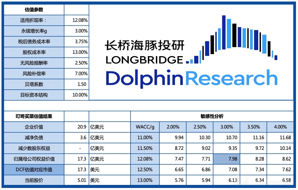在海豚君的预期假设中,2024 年 Non-gaap 净利润转正,长期稳态下,利润率在 3% 左右。在 WACC=12.09%,g=3% 下,DCF 估值为 17.3 亿美金,折合为 8 美元/股,较当前具有近 60% 的溢价空间。