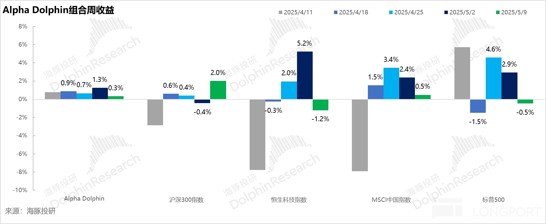 上周海豚投研的虚拟组合 Alpha Dolphin 收益 0.3%,跑输沪深 300(+2%)和 MSCI 中国(+0.5%),但跑赢了与恒生科技(-1.2%)和标普 500(-0.5%)。