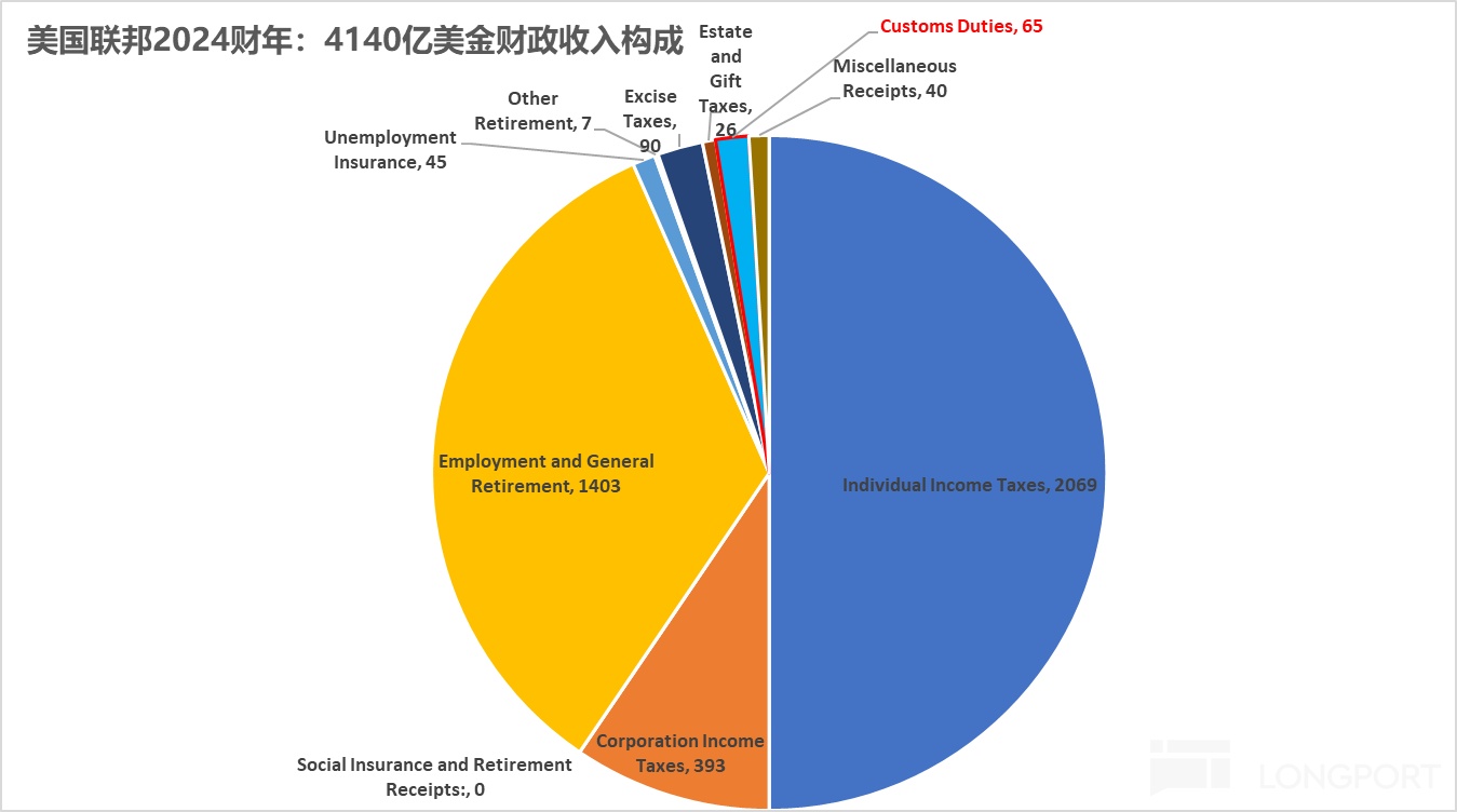 a. 截止 2024 年 10 月的 2024 年美国联邦财年中,650 亿的关税收入仅占美国联邦财政总收入 4.1 万亿的 1.5% 多一些;而这 650 亿的关税收入,对应当年狭义赤字 8000 多亿,广义赤字(含国债付息成本)达到了 1.6 万亿,其实再加关税都很难补上国库的亏空。