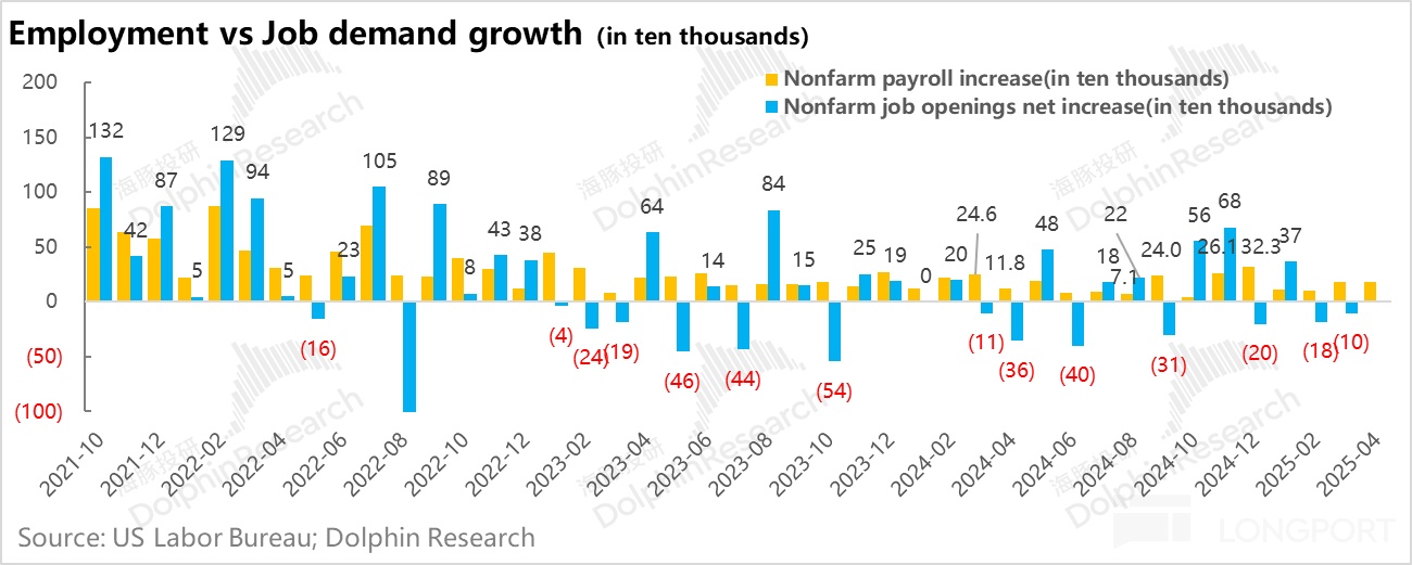 同时,2025 年 2、3 月份美国的企业还在实际减少岗位需求。假如这个节奏持续下去,恐怕下半年就会出现劳动力供给过剩,而需求不足的局面,失业率上升,美国经济就很容易滑下衰退了。