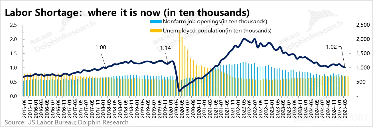 不然,当下美国联邦财政加杠杆结束、居民和企业又不加杠杆,而劳工就业市场上,虽然每个月的新增非农就业人数还不错,但劳动力的供需关系已经跌落到了比疫情前 2019 年还更低的比例关系上——一个失业的人,目前仅对应 1.02 个就业岗位,与 2018 年的水平相似。