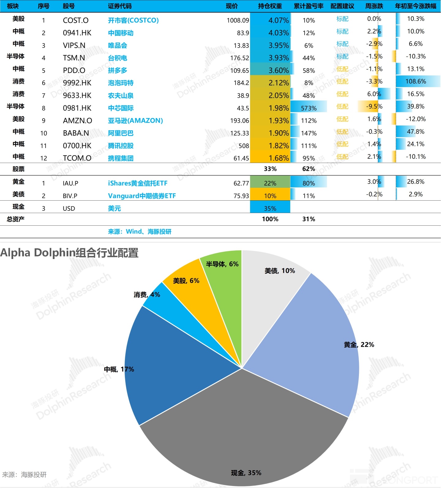 Alpha Dolphin 虚拟组合共计持仓 10 只个股与权益型 ETF,其中标配 1 只,其余低配。股权之外资产主要分布在了黄金、美债和美元现金上,目前组合整体轻仓来应对关税不确定性,同时会密切关注优质资产可能跌出的安全边际。