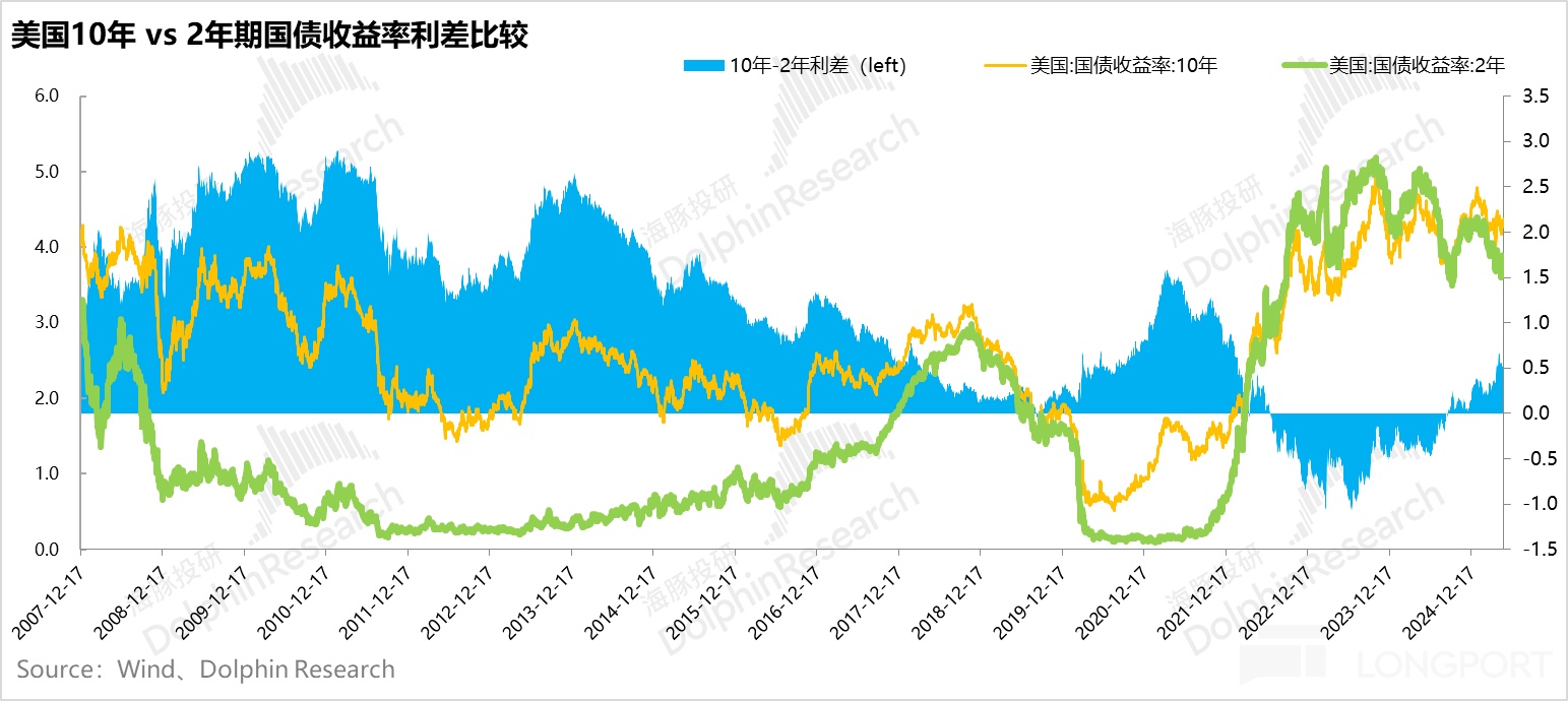 第二是即使短期利率下来了,长债收益率一直盘旋在 4% 以上(最新 4.37%),长短债利差越来越高。资金对购买长债的风险溢价不断拉升,尤其是在特朗普全球 “耍赖” 的情况下,还有愿意购买美国国债的海外主权资金增量又有多少呢?