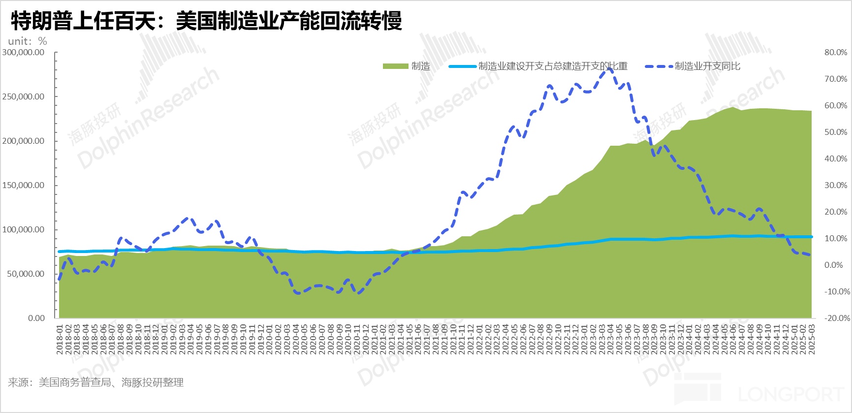 要制造业回流,需要先把制造业产能建出来。从下图美国建造开支流向制造业的开支变化可以看出,特朗普第一任期的制造业建造开支并不高;而拜登的三大经济法案出台后,美国的制造业建造开支增长大幅拉升过一段时间。