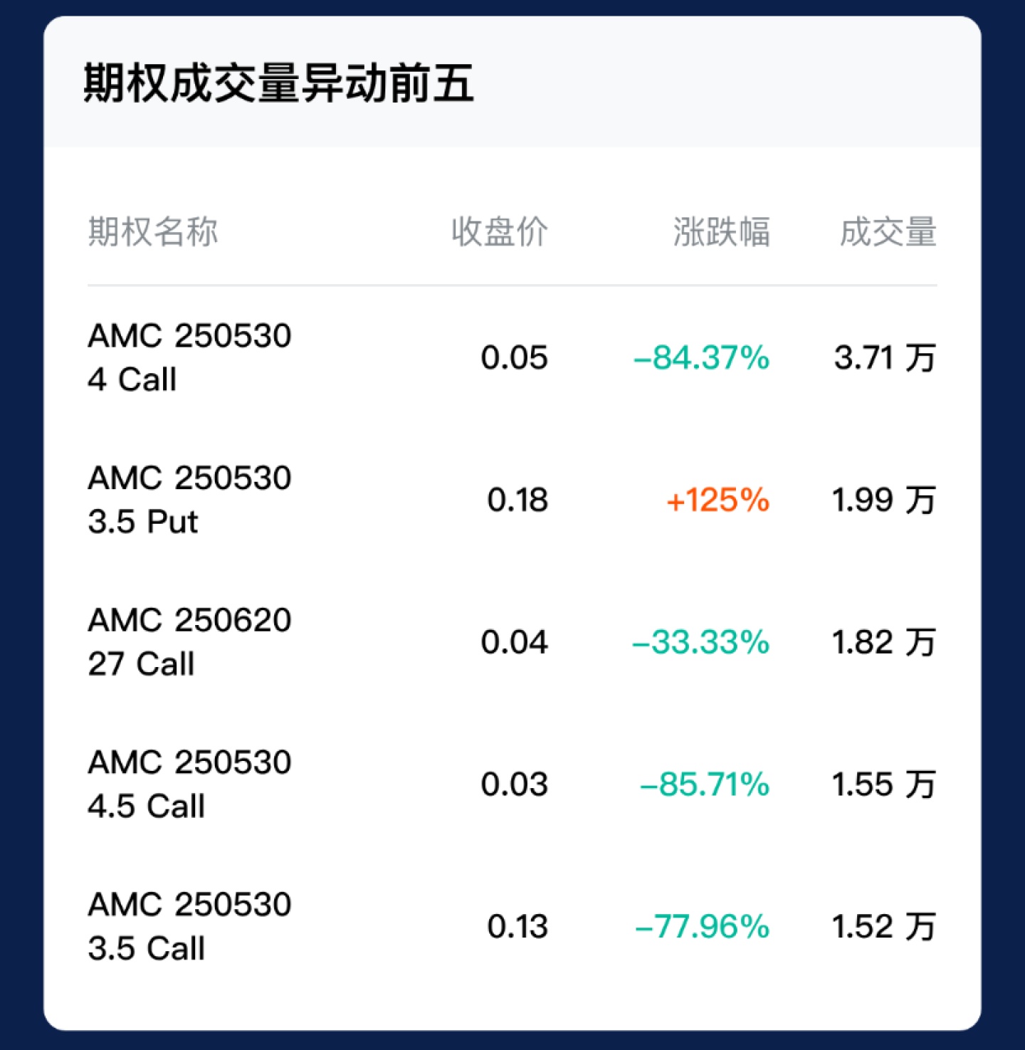 成交量增加最大的期权是到期日为 2025 年 05 月 30 日、行权价为 4 美元的看涨期权,成交 3.71 万张。