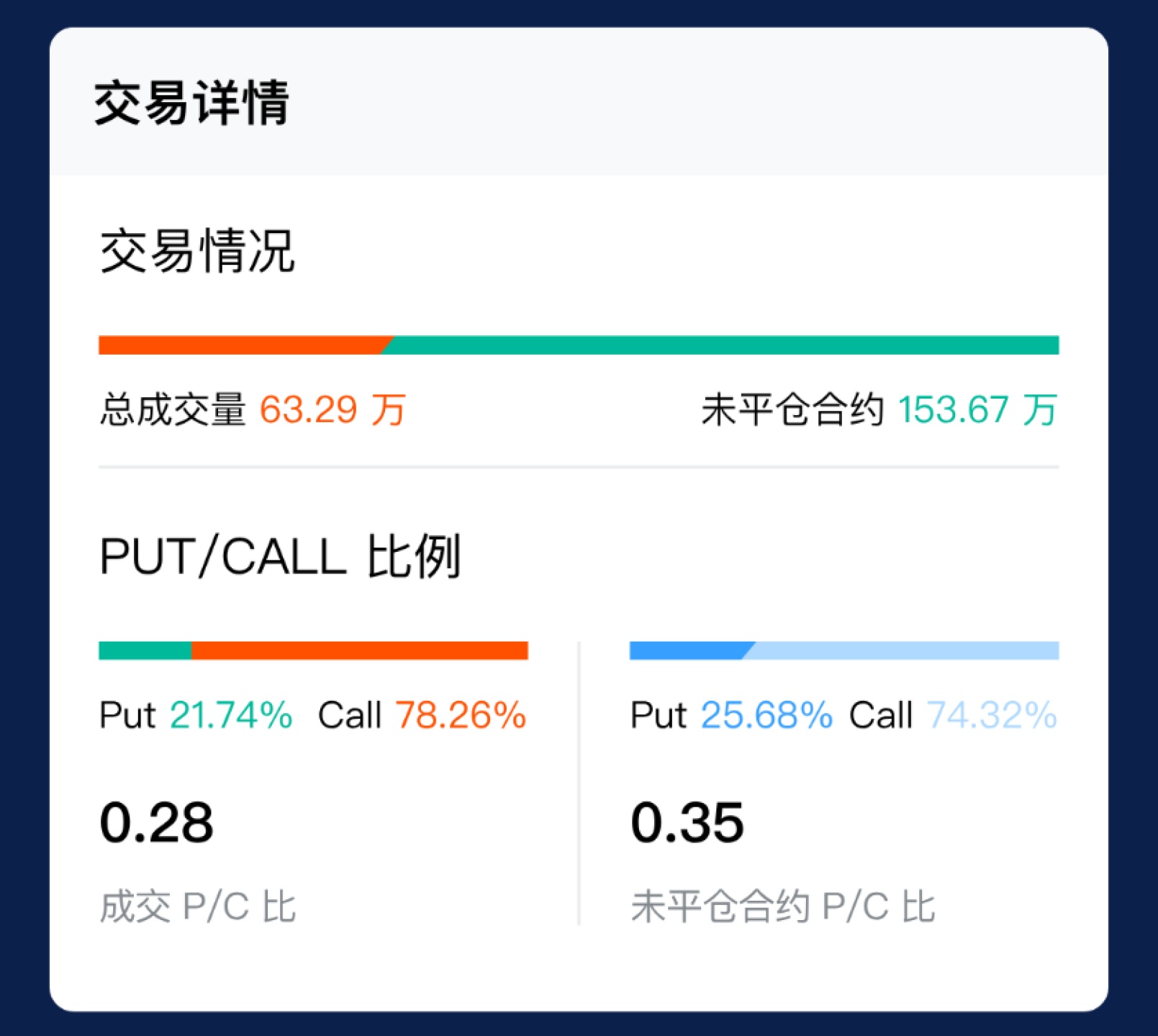 Put/Call:Put 期权交易量与 Call 期权交易量的比值,比值越小,说明做多情绪越大。