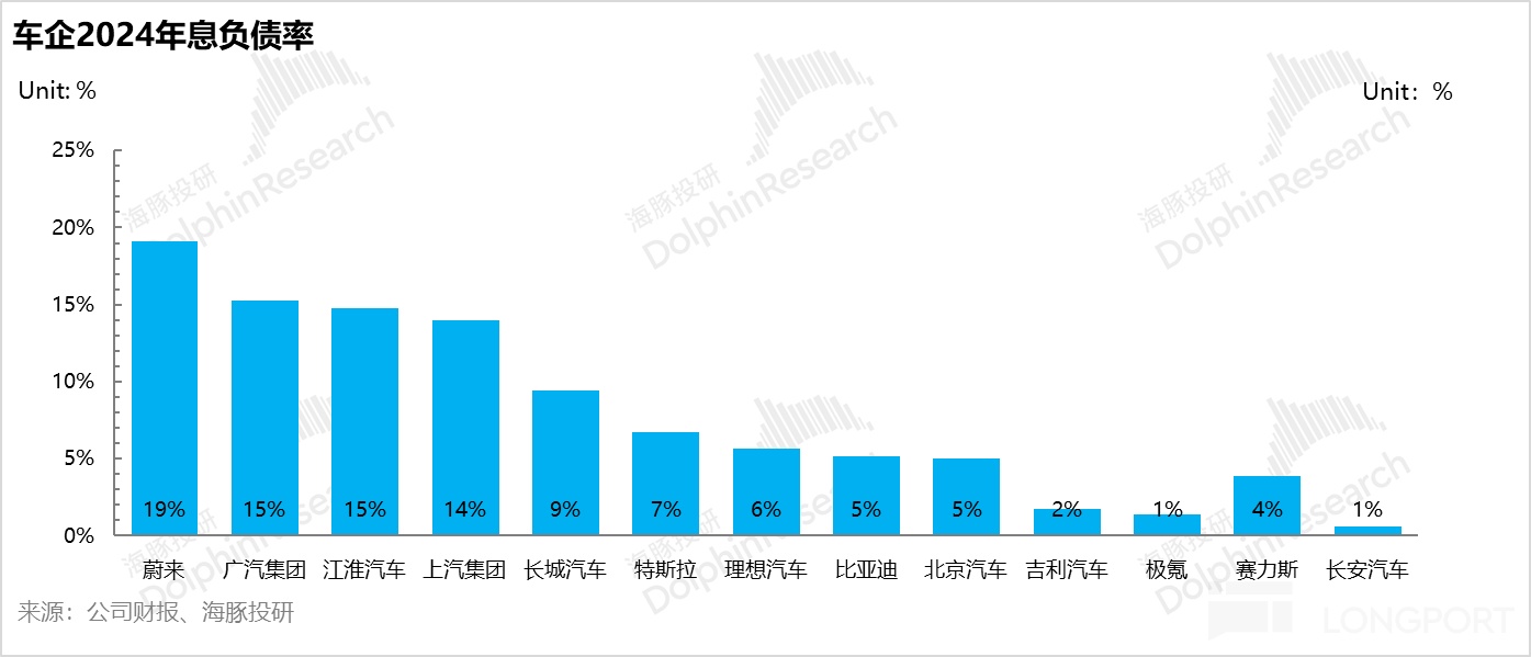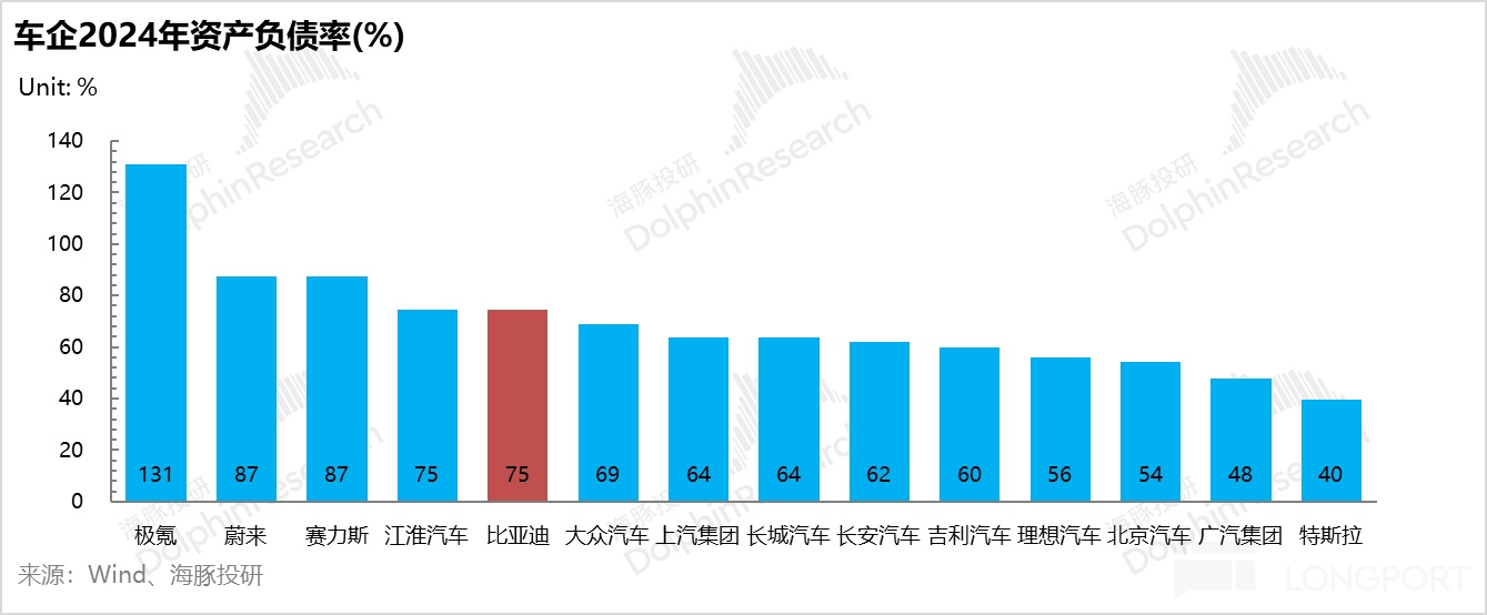 ③ 而比亚迪 2024 年资产负债率在 75% 左右,在汽车行业里只能算个中等偏高的水平,相比喊话的长城汽车高出大概 10 个点左右,但低于极氪和蔚来;