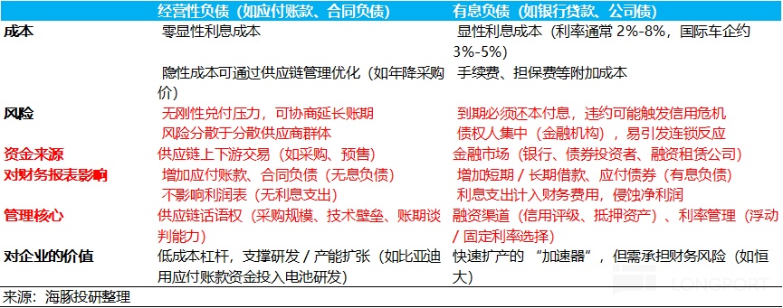 而拿比亚迪来举例子,经营性负债中以应付账款和其他应付款为主,比亚迪主要就是对上游供应链的经营占款,这种欠款不会因为没有第一时间把钱打给供应商,就要给供应商支付利息。