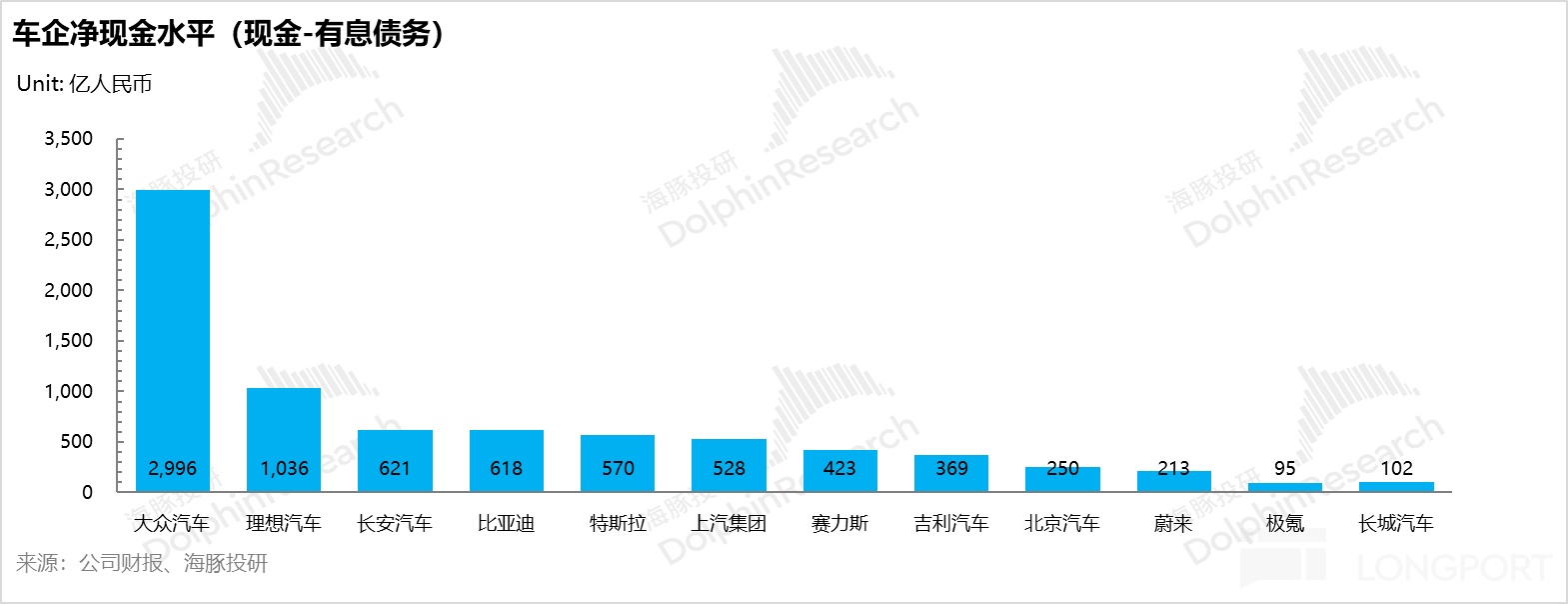 而比亚迪,在这个层面上的安全垫是相对比较高的,无论是有息负债率 5% 左右(处于行业低位,比长城 9% 的有息负债率更低),还是净现金水平位于行业前列(仅次于长安和大众)。