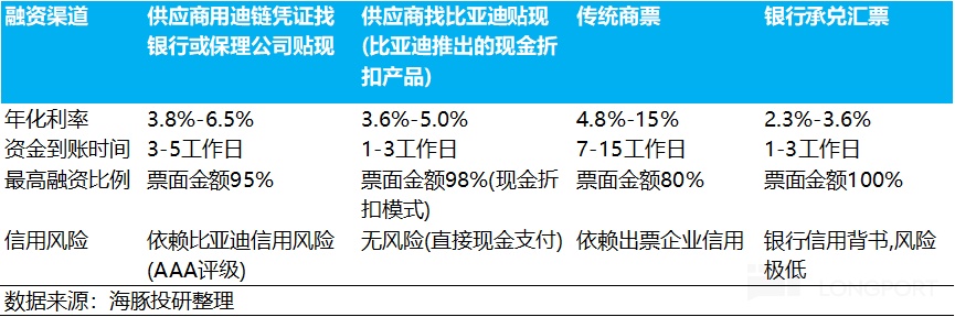 (PS: 比亚迪提供 “现金折扣” 产品,供应商在迪链平台提交申请,审核通过后按票面金额折扣获得提前付款,折扣率由比亚迪设定)。