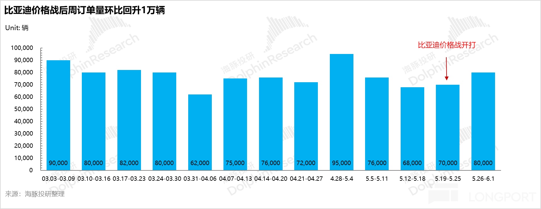目前海豚君已经看到价格战后,比亚迪最新周订单量有所提振(环比回升 1 万辆至 8 万辆),价格战目前看上去短期还是有效果的。