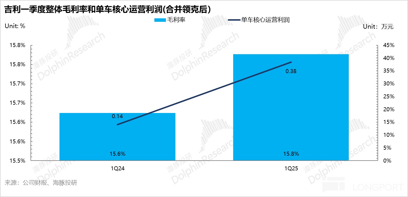 b) 一季度吉利的毛利率 15.8% 左右,同比去年一季度略有上行,但在单车核心运营利润上(核心运营利润=总毛利 - 三费,同样也不考虑政府补贴等其他收入和费用影响),一季度在 0.4 万元左右。