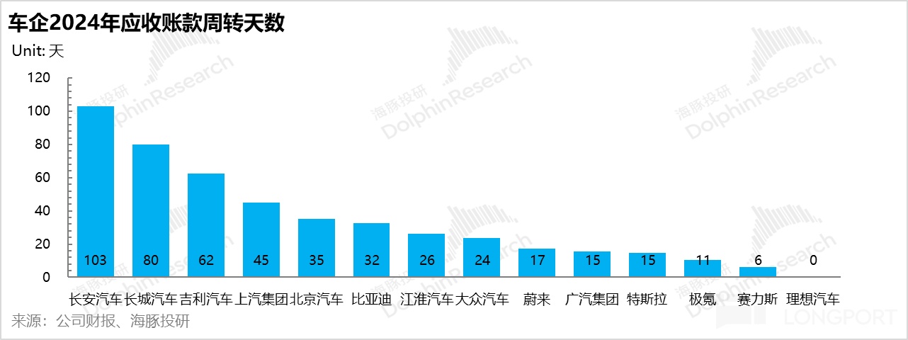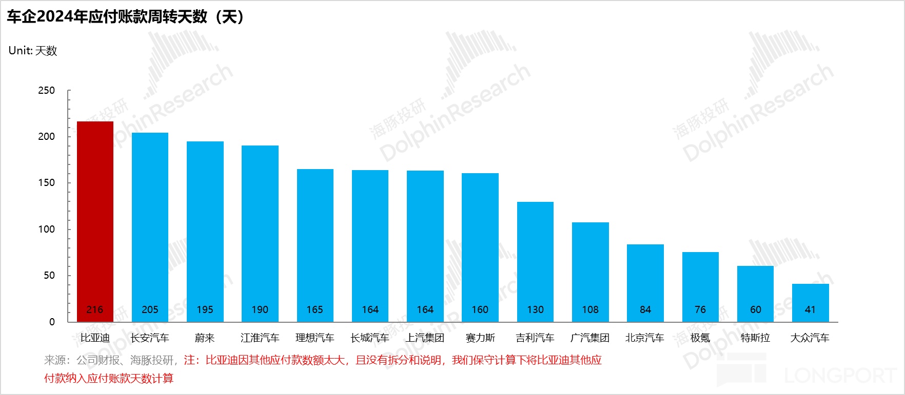 保守起见,海豚君将比亚迪的其他应付款纳入对比的话(其他车企该科目普遍较低,比亚迪该科目披露并不明朗),比亚迪确实 2024 年应付账款天数到了接近 7 个月之久,位居车企首位。