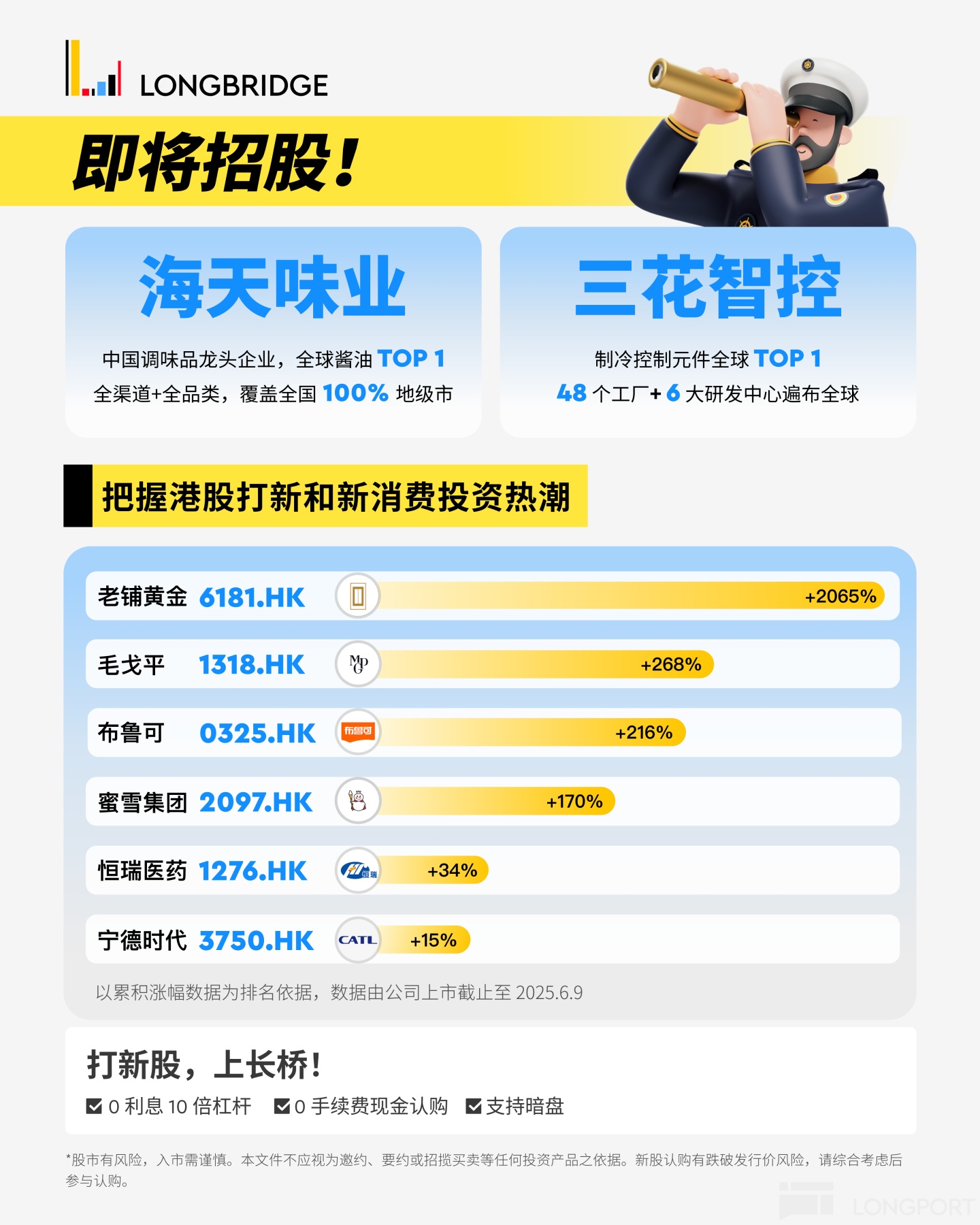 港交所即将迎来三家行业巨头同步冲刺 IPO !调味品龙头 “酱油茅” 海天味业、全球热管理技术霸主三花智控、国民珠宝品牌周六福均已通过上市聆讯,拟登陆港股主板。以下为新股核心信息解析: