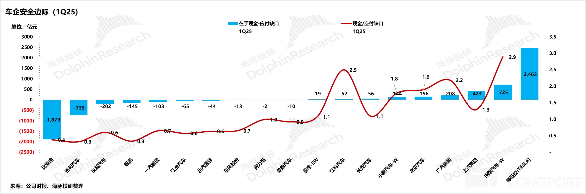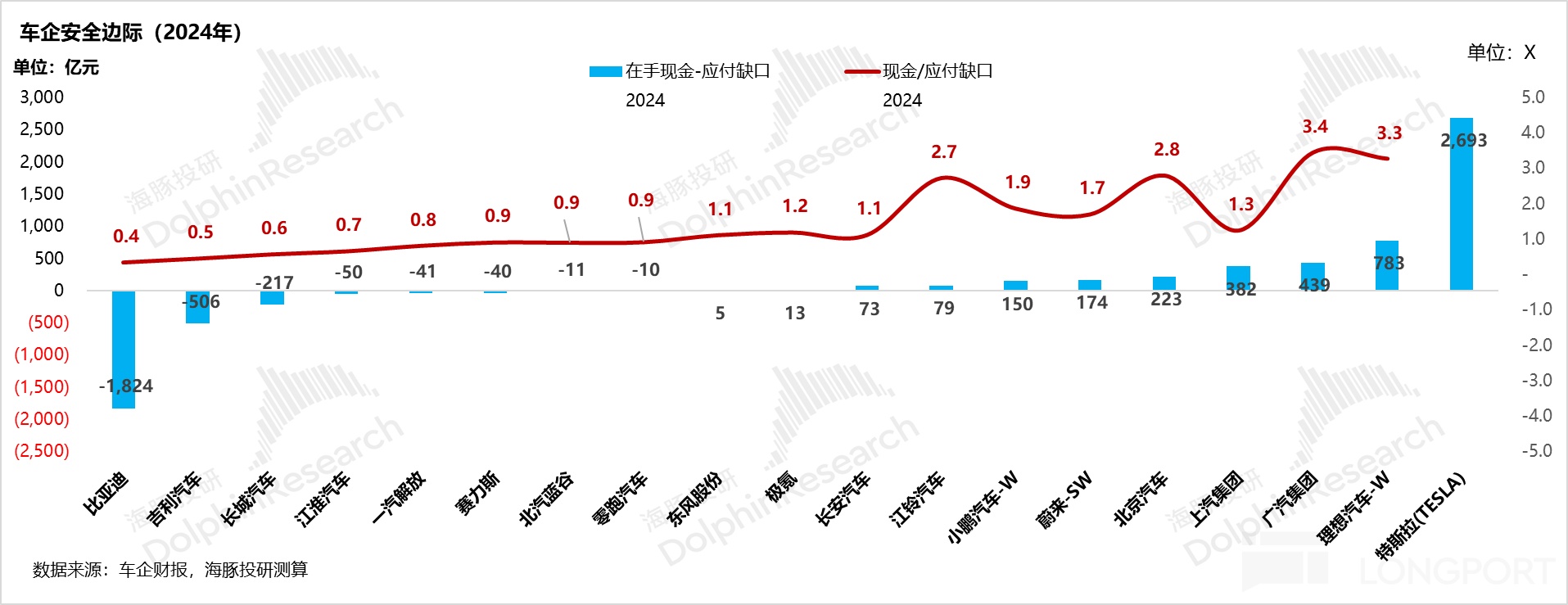 1)最安全第一梯队,安全边际最高:特斯拉(本身账期短 + 高在手现金)和理想(经营现金流充裕),在手现金完全能覆盖应付缺口,还能用一定现金剩余来应对日常经营,完全无需额外债券或者股权融资;