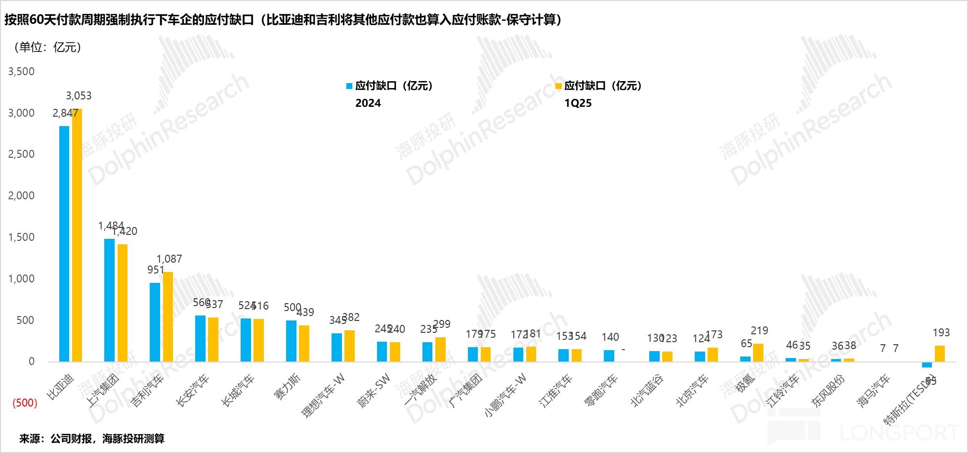 b. 再用公司当期报表上的实际应付账款金额,去减掉按照 60 天周期下的应付金额,二者差值就是改为 60 日应付账款账期后,各家车企需要还给供应商的金额。海豚君把这个差值暂且称为 “应付缺口”。