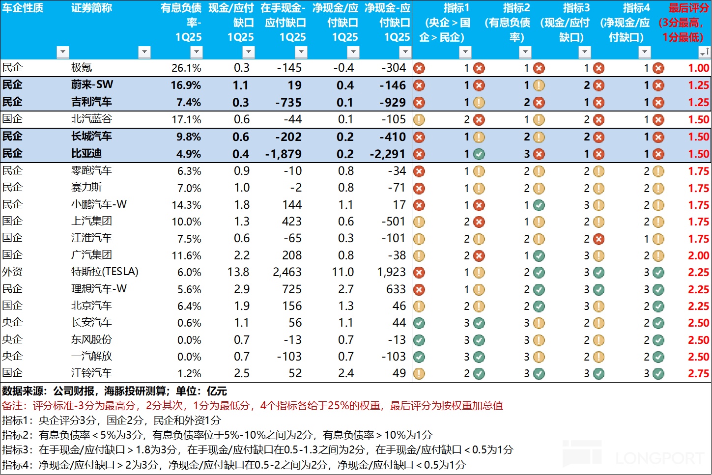 同时踩中这三类情况的车企,可能会是极端负面情形下再融资风险最大的玩家 ,海豚君通过罗列的 4 个指标进行评分(见下图:4 个指标各给于 25% 的权重,最后评分按权重加总值从低到高排序),风险最高的车企是:蔚来汽车,吉利汽车,长城汽车,比亚迪。