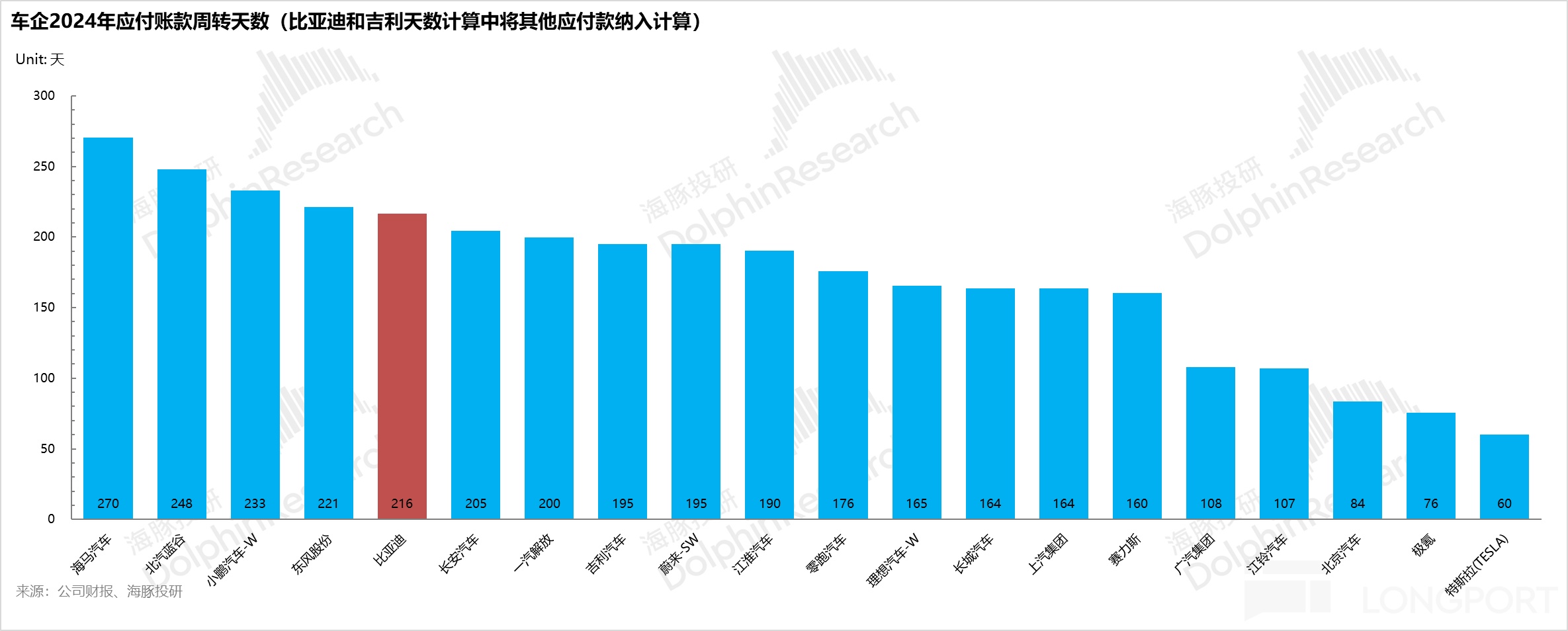 然而,在我们拉出来的一众汽车公司中,2024 年仅特斯拉一家 60 天账期达标。中国车企平均应付账款周期长达 5-6 个月(比亚迪近 7 个月,海马/北汽蓝谷达 8-9 个月)。