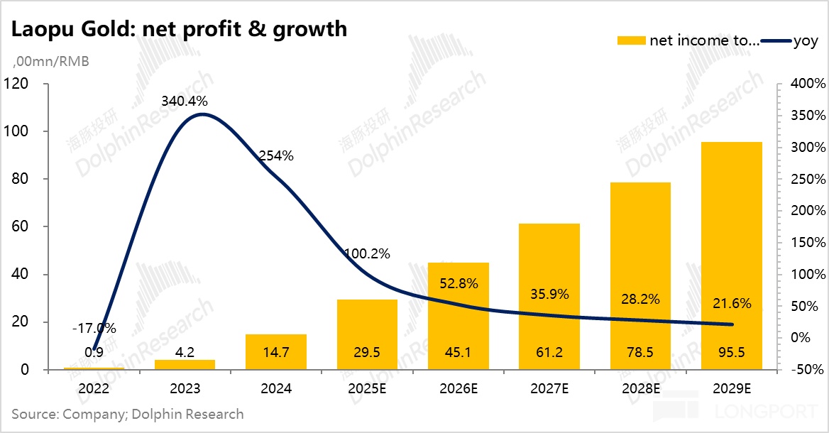 费用上,根据前文分析,门店租金、重奢商场进驻费&平台费、销售人员的薪酬占销售费用超过 90%,其中海豚君假设门店租金、销售人员薪酬等固定成本将随着同店的持续增长进一步摊薄,而商场进驻费&平台费也会随着老铺品牌力的提升逐步下降,最终利润端经营杠杆释放下,从 2025 为起点,未来 4 年老铺利润端接近 40% 的复合增速。