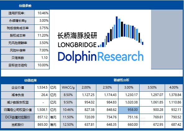 从绝对估值的角度,假设 WACC=10.5%,永续增长率 3% 的情况下 DCF 测算出的老铺黄金的股价为 958 港币,也就溢价了 8%。