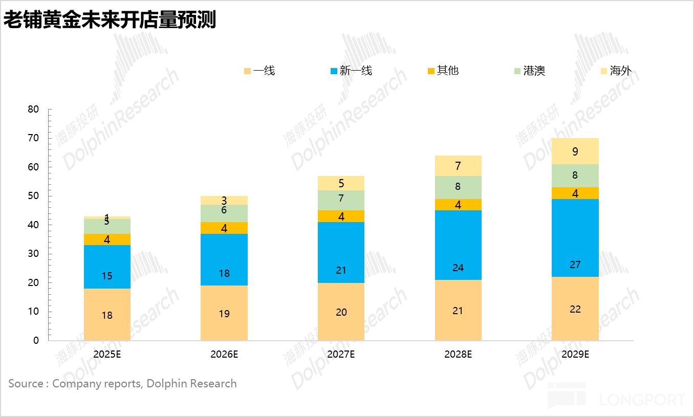 开店节奏上,为了严控稀缺性,避免渠道泛滥,海豚君假设老铺保持少量匀速开店(国内 4-5 家,海外 1-2 家),具体的开店量见下图。