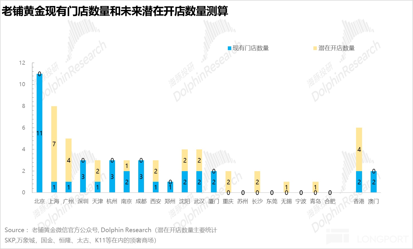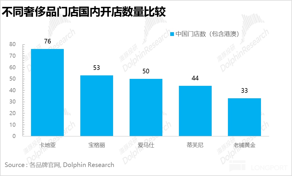 海豚君统计了一线、新一线城市在内的包括 SKP、万象城、国金、恒隆、太古、K11 等所有重奢商圈,从下图可以看到国内老铺未来潜在开店空间应该可以达到 67 家(含港澳),较当前有接近一倍的提升空间,和卡地亚、宝格丽、爱马仕等国际奢侈品在国内的开店数量相近。