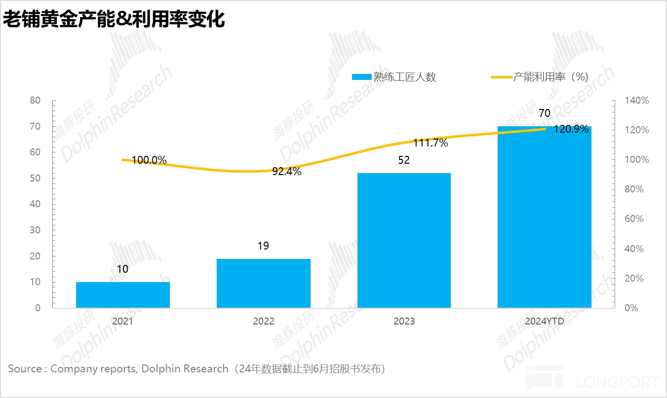 从下图可以看到,熟练工匠的人数 2023 年开始大幅增长,正好对应老铺需求端的爆发,而产能利用率也刚刚好控制在 100% 左右。