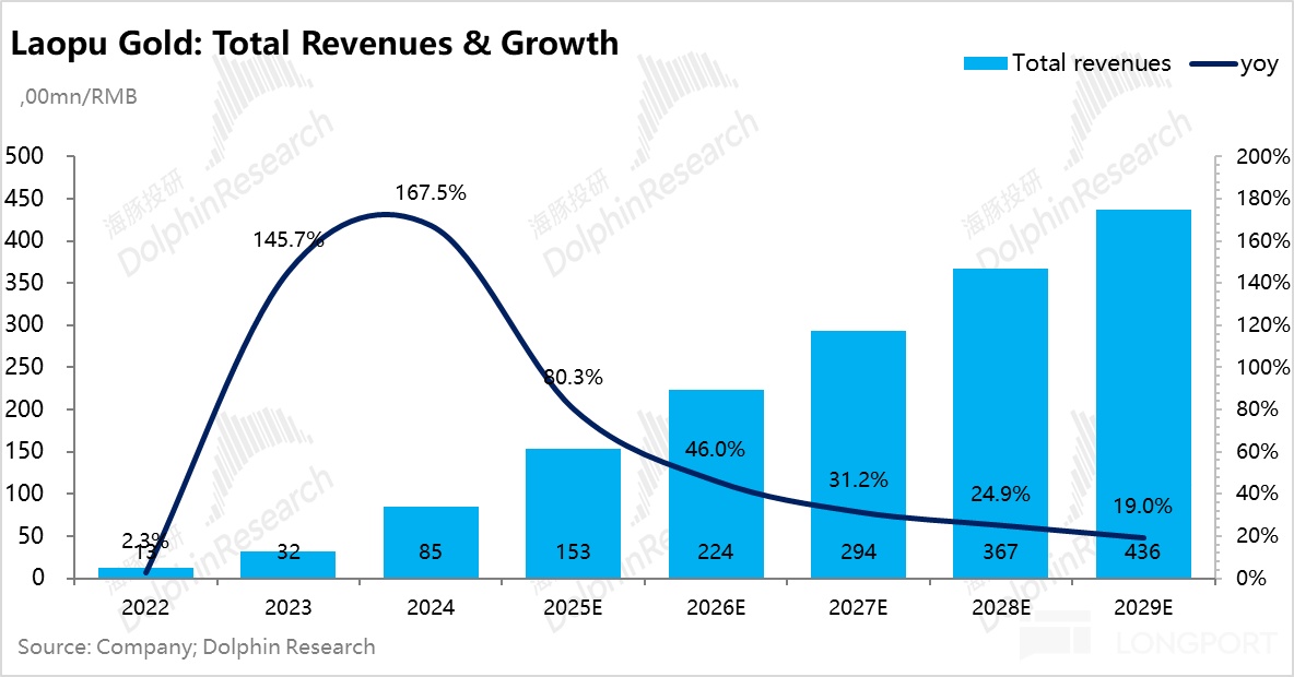 但另一方面,考虑到老铺的店效经过了 2023、2024 连续两年的翻倍提升,叠加未来老铺在相同地区开店,稀缺性下降也会稀释部分同店营收的增长,因此虽然单店营收的增长仍然是老铺营收的核心驱动,但海豚君假设单店营收增速逐步放缓。