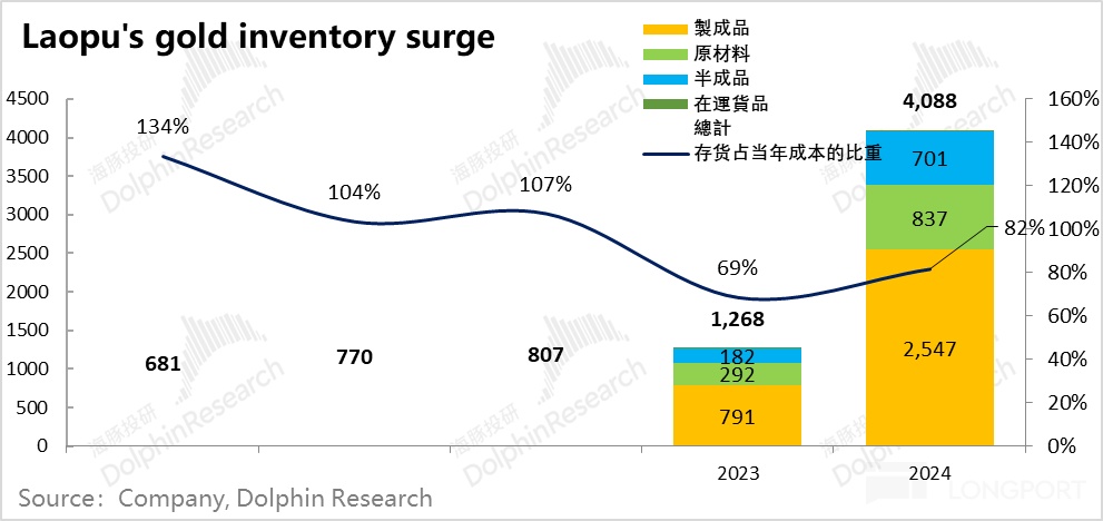 也就是说,当下公司在成长期,2024 年年末的存货是为 2025 年的收入做准备的,而且 2025 年收入也在扩张的情况下,2024 年的屯的黄金价值,也就是 2024 年成本的 82% 而已。