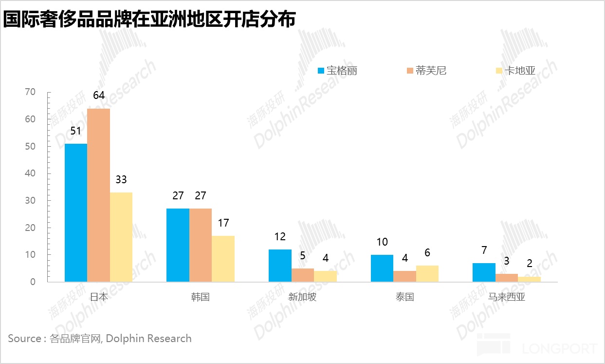 但由于老铺的出海刚起步,且不同于国内,品牌力尚未得到验证,海豚君这里先不做开店上限的判断,但从下图国际奢侈品品牌在亚洲各国的开店数量可以看出海外的开店潜在空间并不小。