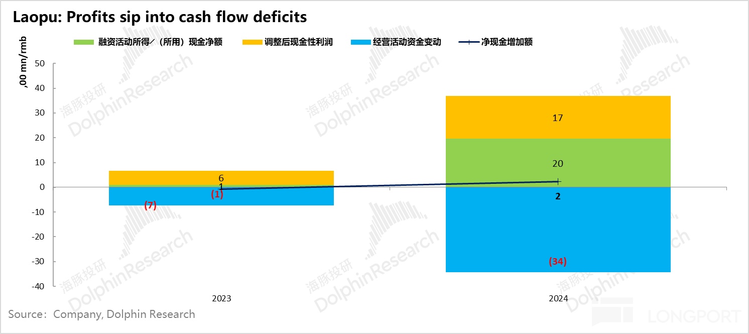 这里的问题就来了,别家业务做大的过程中普遍是占用上下游的资金,像比亚迪一样尽量用上下游的钱来维持公司运营,为何老铺黄金只有账面利润,实际经营现金流经营流水越高、利润越高,反而越穷,经营窟窿越大呢?
