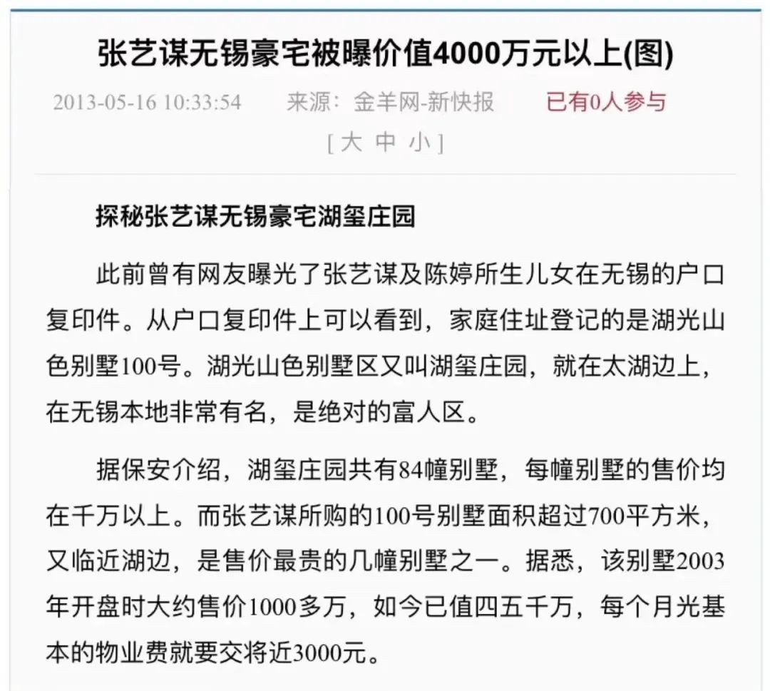2013 年 5 月,新快报就曾发布过 “张艺谋无锡豪宅被曝价值 4000 万元以上” 的报道,也就是说,除非湖玺庄园房产证上并非张艺谋的名字,否则其 2016 年的 “无房职工” 身份就立不住脚。