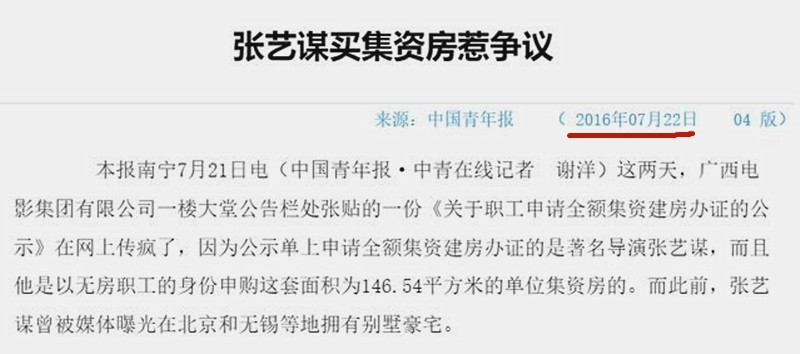 2016 年 7 月,张导还因以无房职工的身份申购单位集资房,引发舆情,不过时任广西电影集团有限公司项目开发部经理黄健表示,张艺谋购买单位的全额集资房合法正当,但争议仍未平息,核心点并不在于质疑张艺谋是否有购买集资房的资格,而是在于其是否为无房职工的身份。