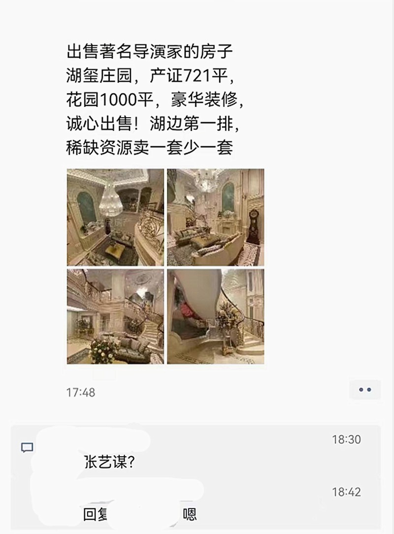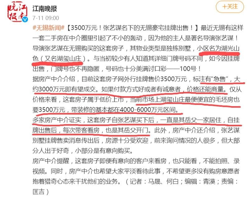 2022 年 7 月 11 日上午,无锡本地媒体《江南晚报》一篇 “张艺谋 3000 万急售无锡临湖别墅” 的博文以迅雷不及掩耳之势刷爆了社交平台,空降热搜榜,而江南晚报引用的原始信源之一,来自于一条中介的朋友圈,据该中介描述,房子叫湖玺庄园,产证 721 平,花园 1000 平,豪华装修,湖边第一排,稀缺资源,卖一套,少一套。