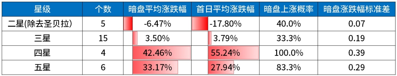最直观的,四星股票平均涨幅最高,暗盘上涨概率还是 100%,是不是说四星比五星更值得梭哈?