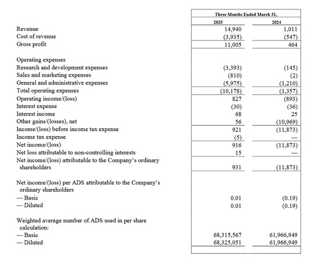 2025 年第一季度,公司营收达到 1,490 万美元,创下历史新高,同比增长 1,378%(2024 年同期为 100 万美元)。毛利润为 1,100 万美元,同比增长 2,272%,毛利率达 73.7%。公司实现营业利润 80 万美元,扭转了去年同期 90 万美元的营业亏损,对应营业利润率为 5%。第一季度,公司实现净利润 90 万美元,每股摊薄后美国存托凭证(ADS)收益为 0.05 美元,而去年同期净亏损为 1,190 万美元。截至季度末,平台客户资产增长 11%,达到 12.75 亿美元;完成 KYC 认证的用户数量同比增长 22%,达到 4,657 人,人均资产约为 27.4 万美元。