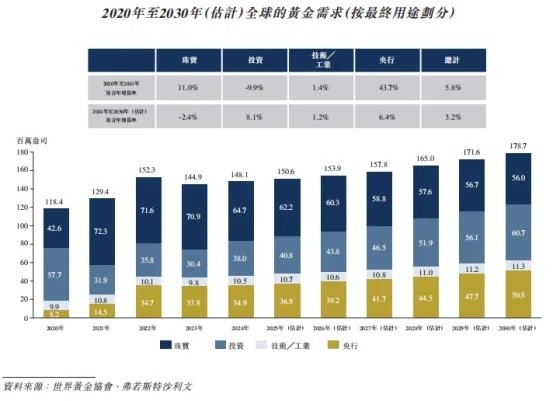 于 2024 年至 2030 年,全球黄金需求预计将以 3.2% 的复合年增长率稳步增长,主要是由于 (i) 在当前地缘政治不确定性的背景下,各国央行为保值和分散风险而增加黄金需求;及 (ii) 投资黄金需求增加。