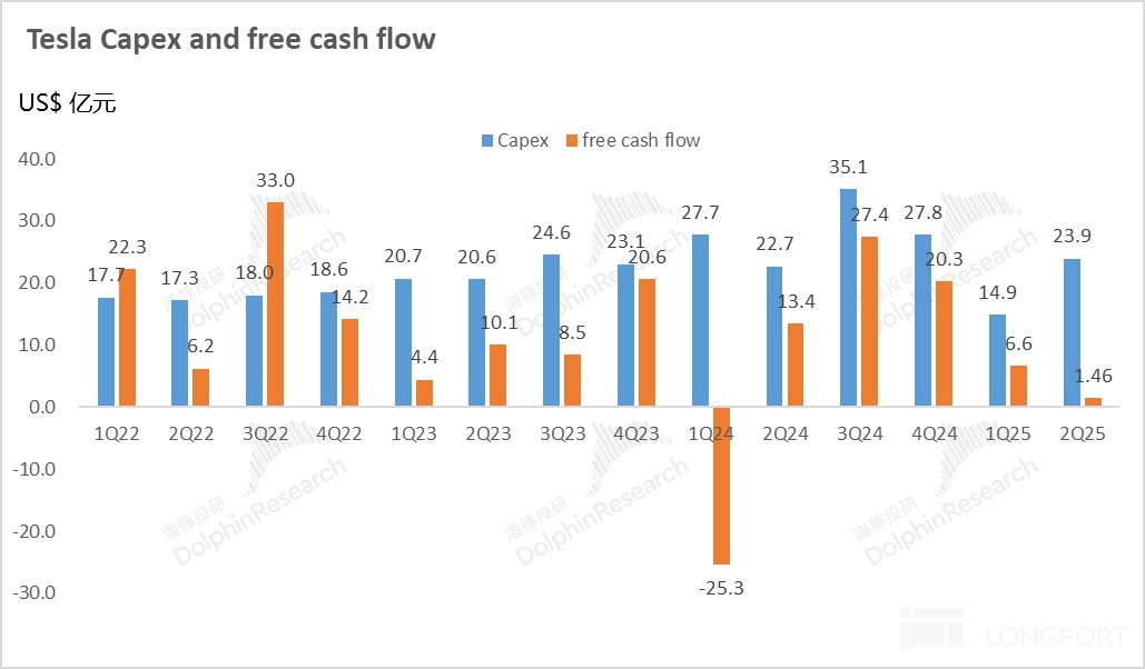 而自由现金流本季度运营现金流由于基本面的转好有所上行,资本开支上24亿,继续环比上行了9亿!仍然还在为AI业务狂投,特斯拉又在德州新增了1.6万块H200 GPU, 所以最后自由现金流仍然相比上季度卖车最烂期还要环比下滑了5亿至本季度仅1.5亿。