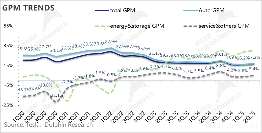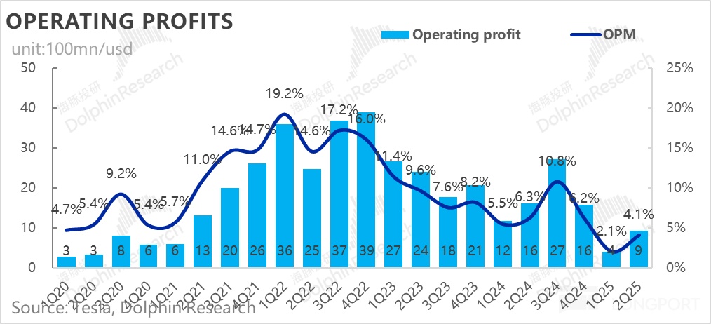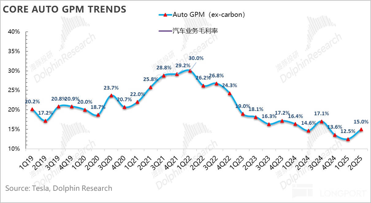 3. 卖车毛利率同样因为Juniper的上市涨价,及规模效应的改善,终于也开始环比回升了:二季度汽车销售毛利率(剔碳积分和租赁)15%,环比改善了2.5个百分点,仍然主要由于二季度的Model Y Juniper上市的定价更高,从而带来更高的卖车单价所拉动。而同时本季度摊折成本因为规模效应的下滑,对冲了关税效应的不利影响。