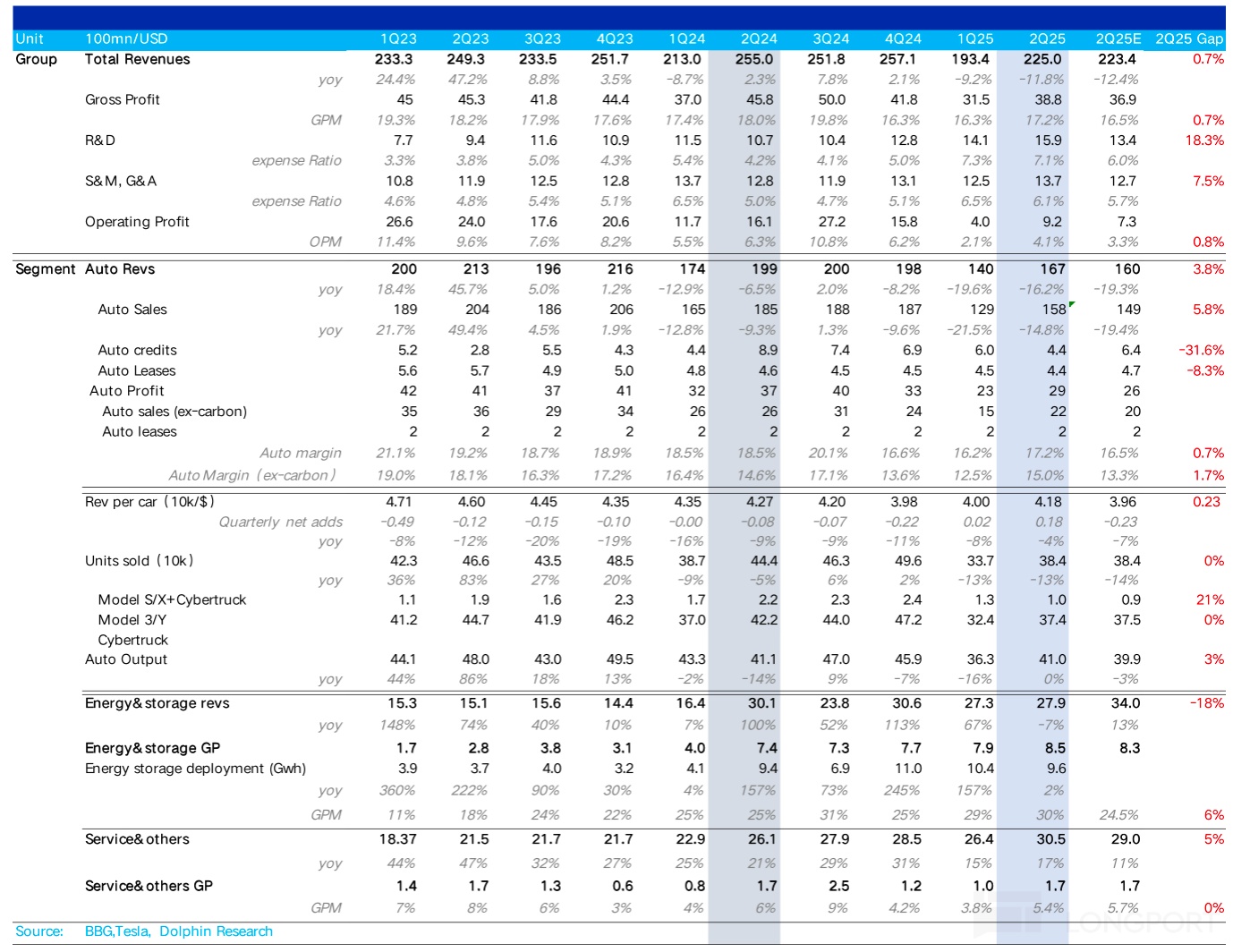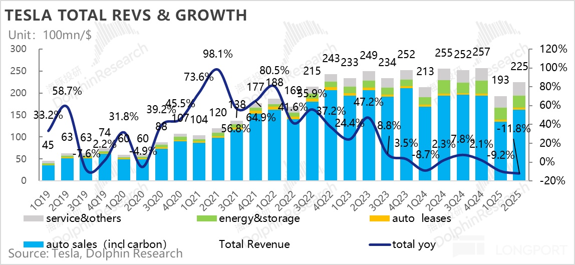 1. 总收入端表现不错:本季度总收入端225亿,超出市场预期2-3亿左右,储能业务因为关税影响收入端表现平平其实已经被price in, 而服务业务本季度还在环比上行,表现也不错,但真正超预期的仍然在最核心的汽车业务上,汽车业务基本盘终于开始有所回暖!