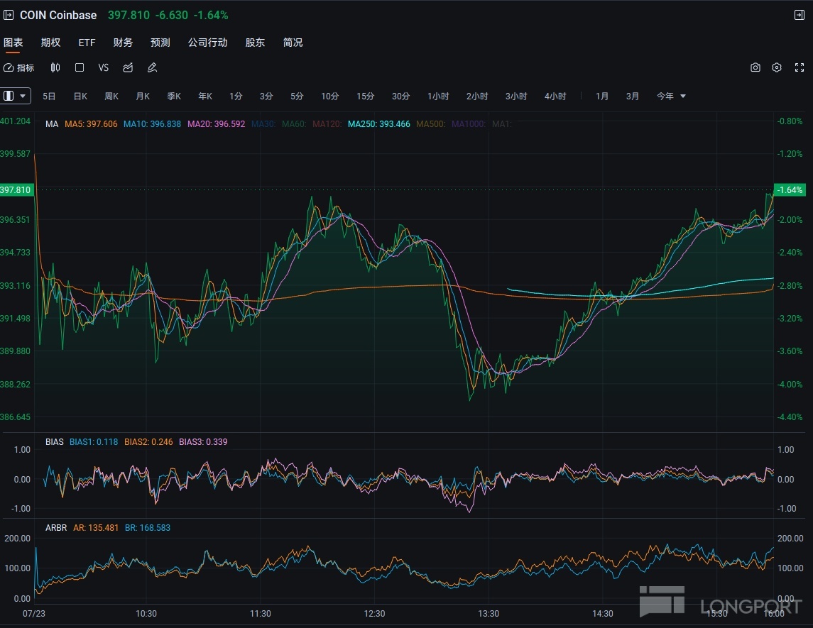 Coinbase (COIN) 23 日早盘低价震荡,中午回弹,在 394-397 之间拉扯,午后极速下跌至 387。而后买盘力量增强,收跌 1.64%.