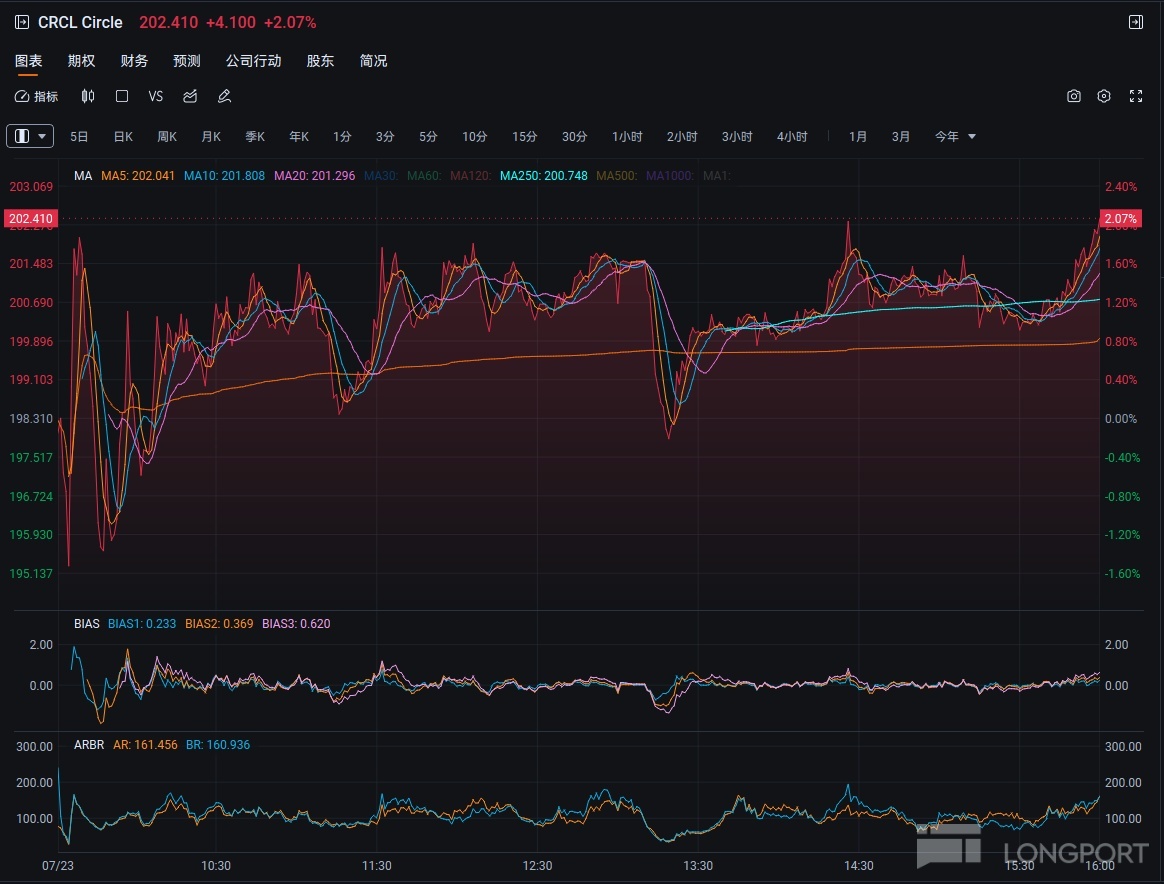 Circle (CRCL) 23 日走势大体稳健,多头趋势相对较强。虽然盘中有 3 次急剧下跌,但是很快拉回 200 以上,收涨 2.07%。