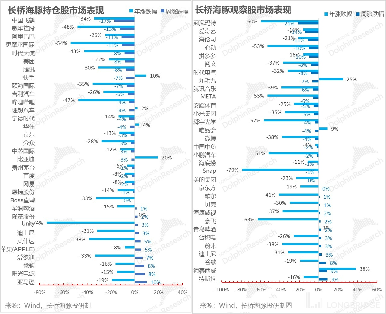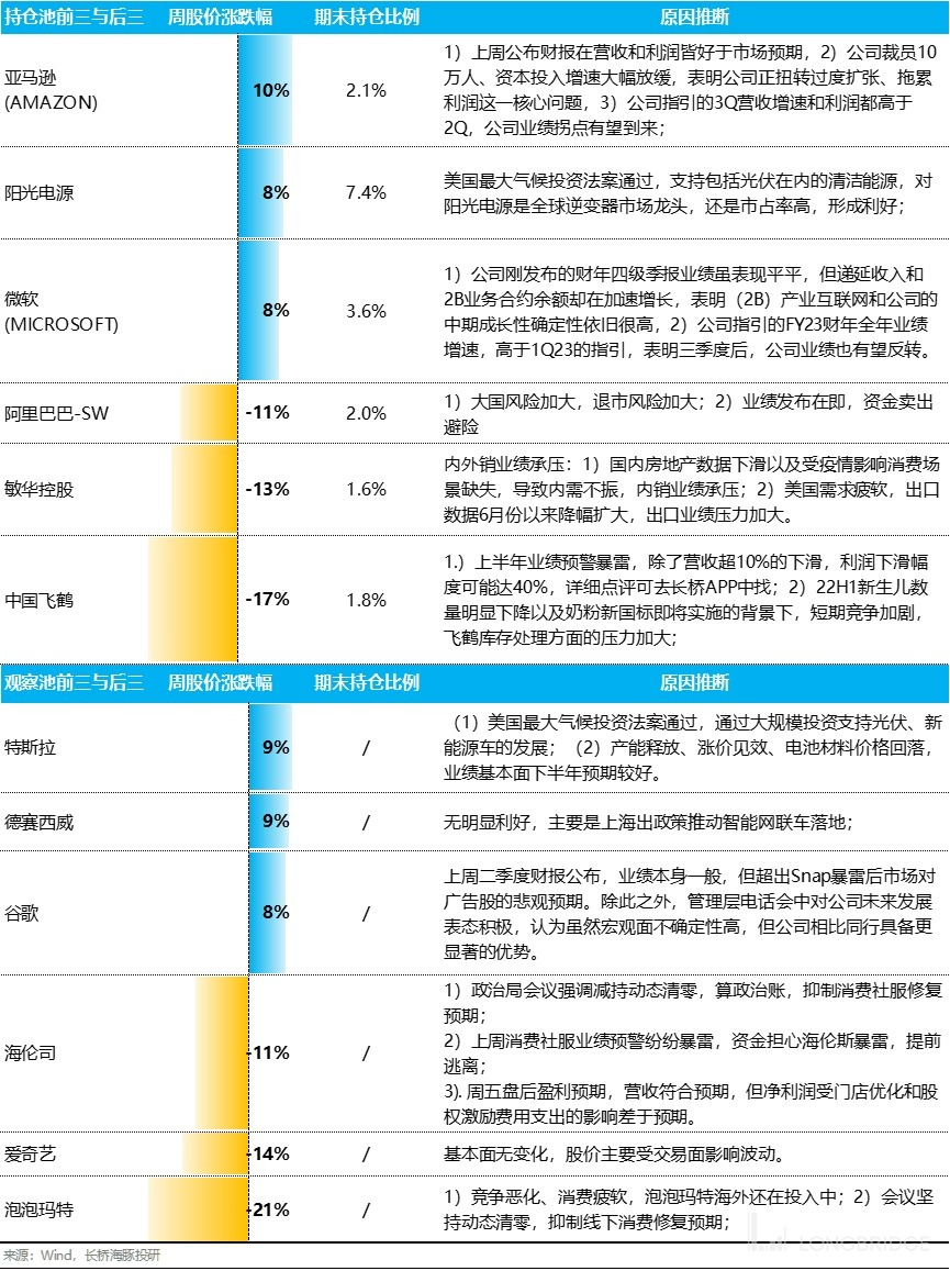 上周海豚持仓中,主要是持仓权重占比 25%+ 的中概资产跌幅较大,另外由于疫情防控上强调动态清零不放松,再加上消费股很多业绩预警暴雷,当期业绩差,同时预期修复的前景也被压制,而涨幅靠前的主要是美股。